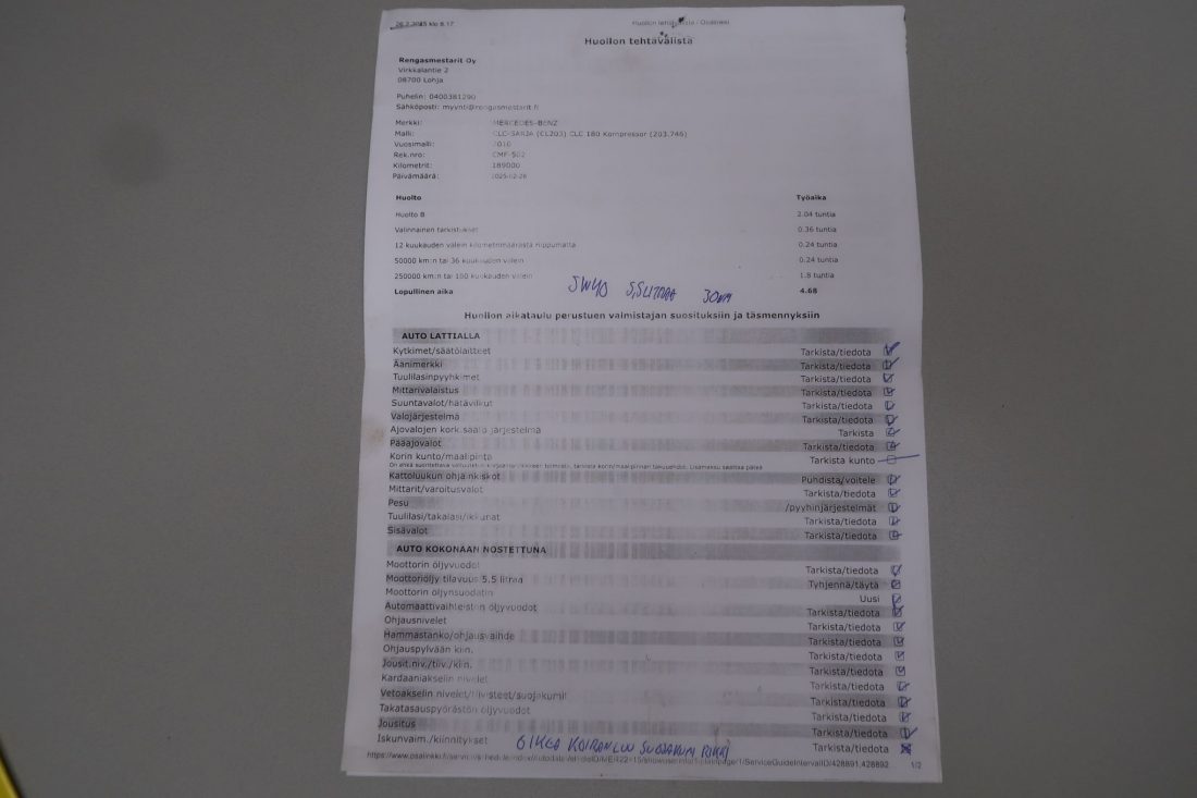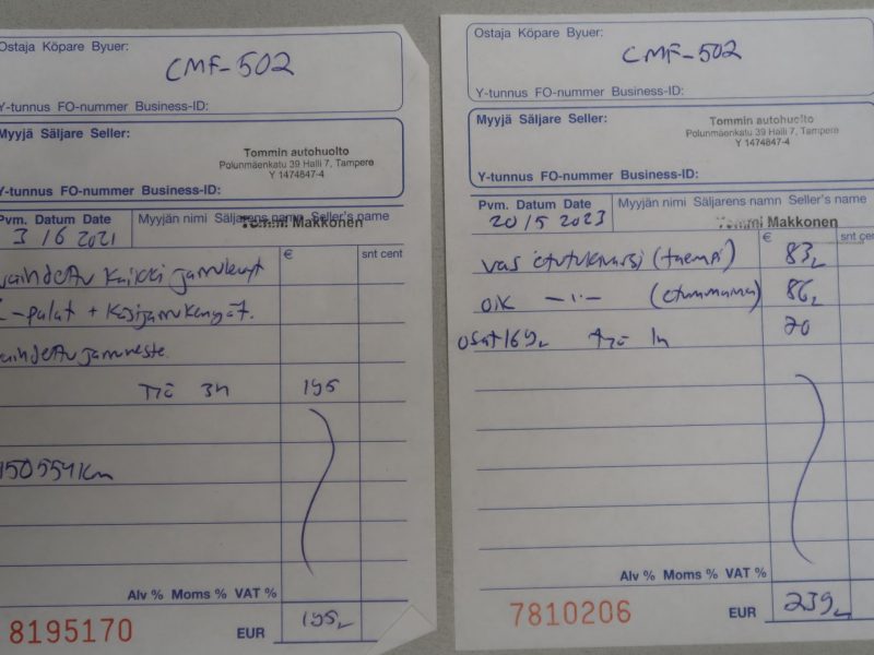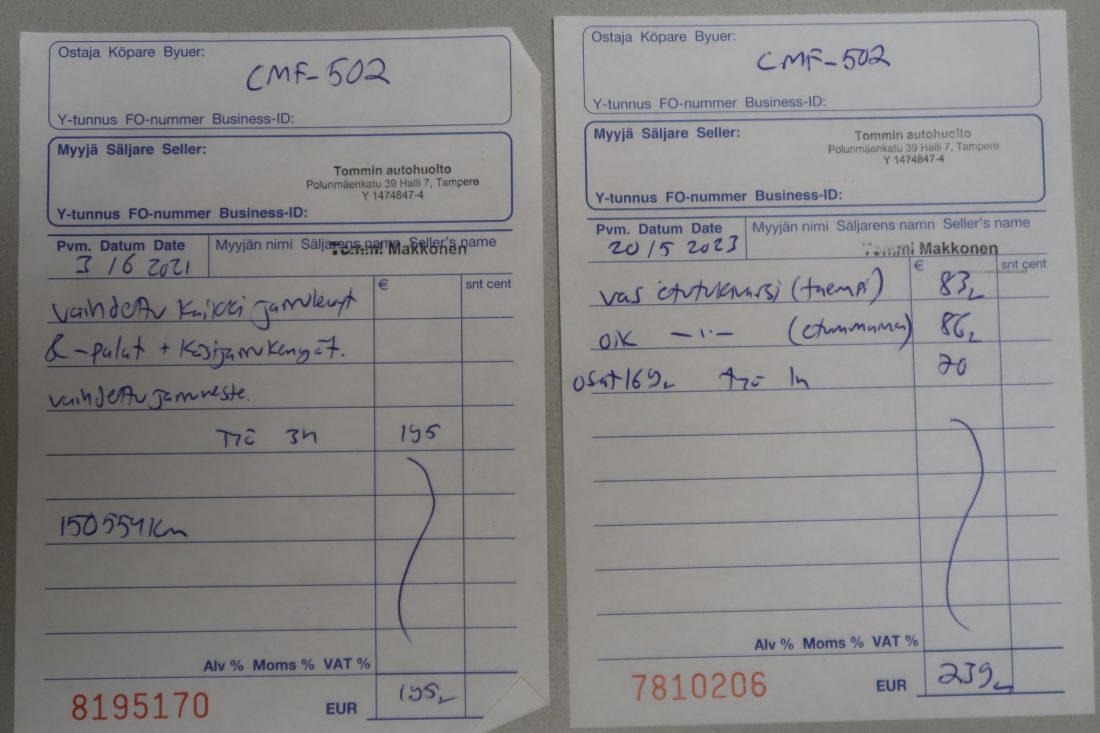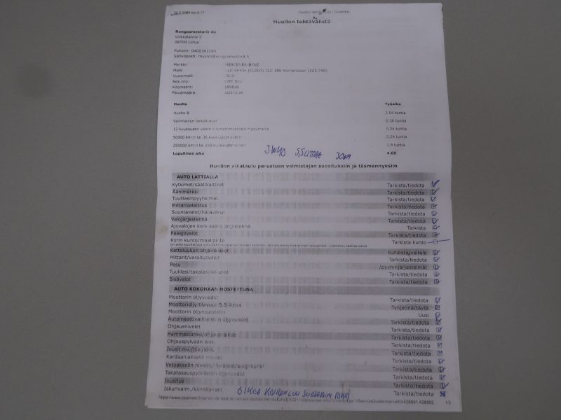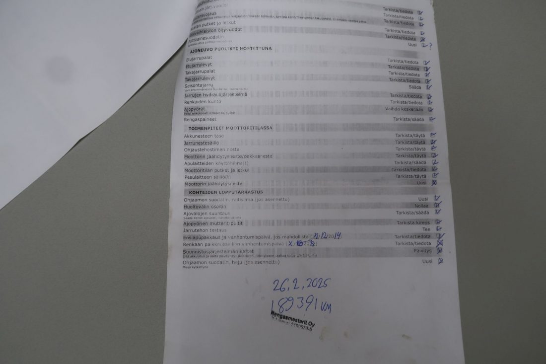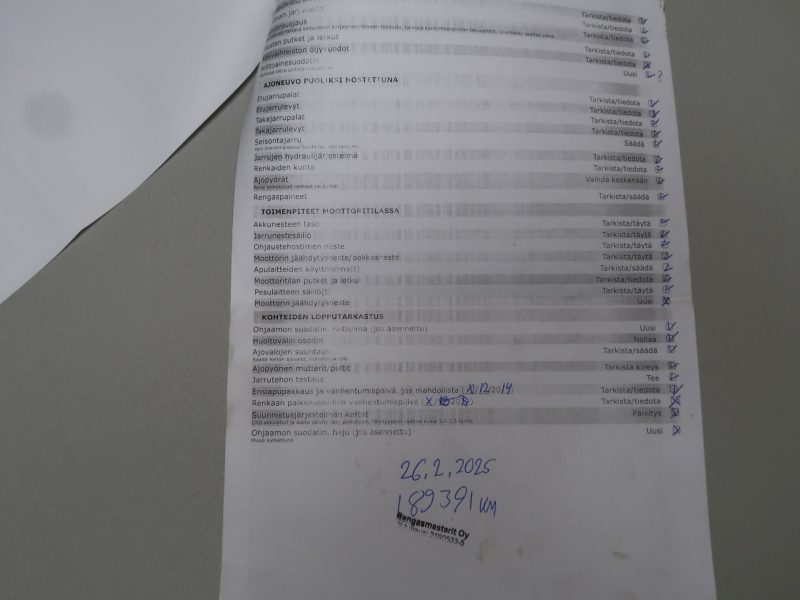 Viimeinen huolto tehty 26.2.2025 189391km:ssä. Katsastettu 15.7.2025