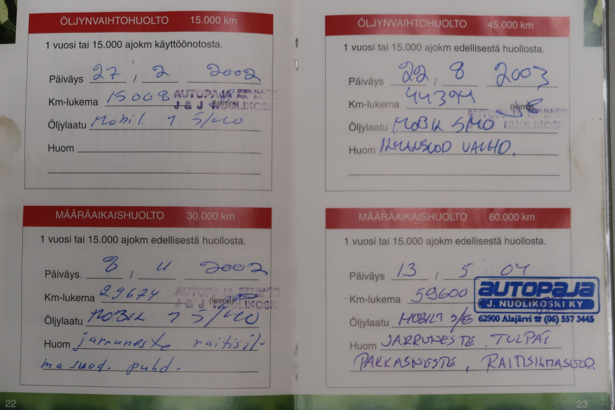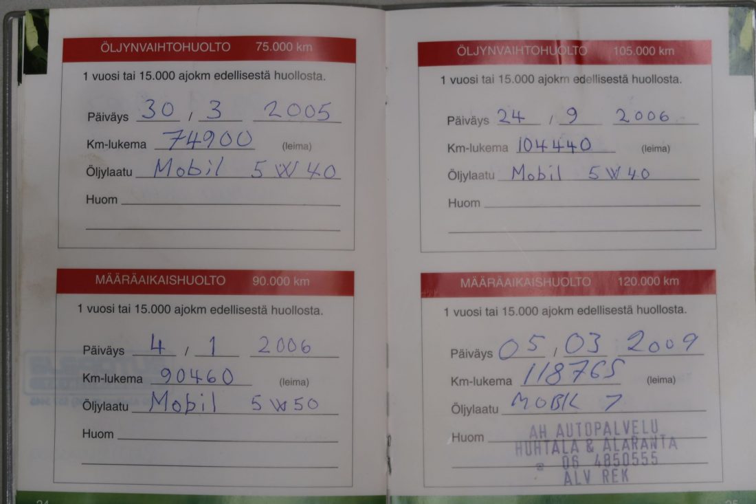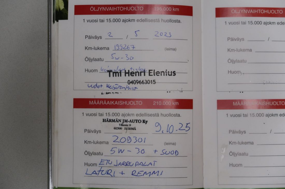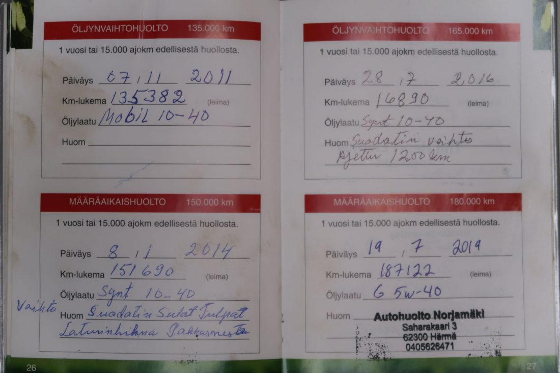 Viimeinen huolto tehty 9.10.2025 209301km:ssä, jossa vaihdettu moottoriöljyt, suodatin, uusittu laturi ja remmi sekä vaihdettu jarrupalat eteen. Katsastettu 10.12.2025